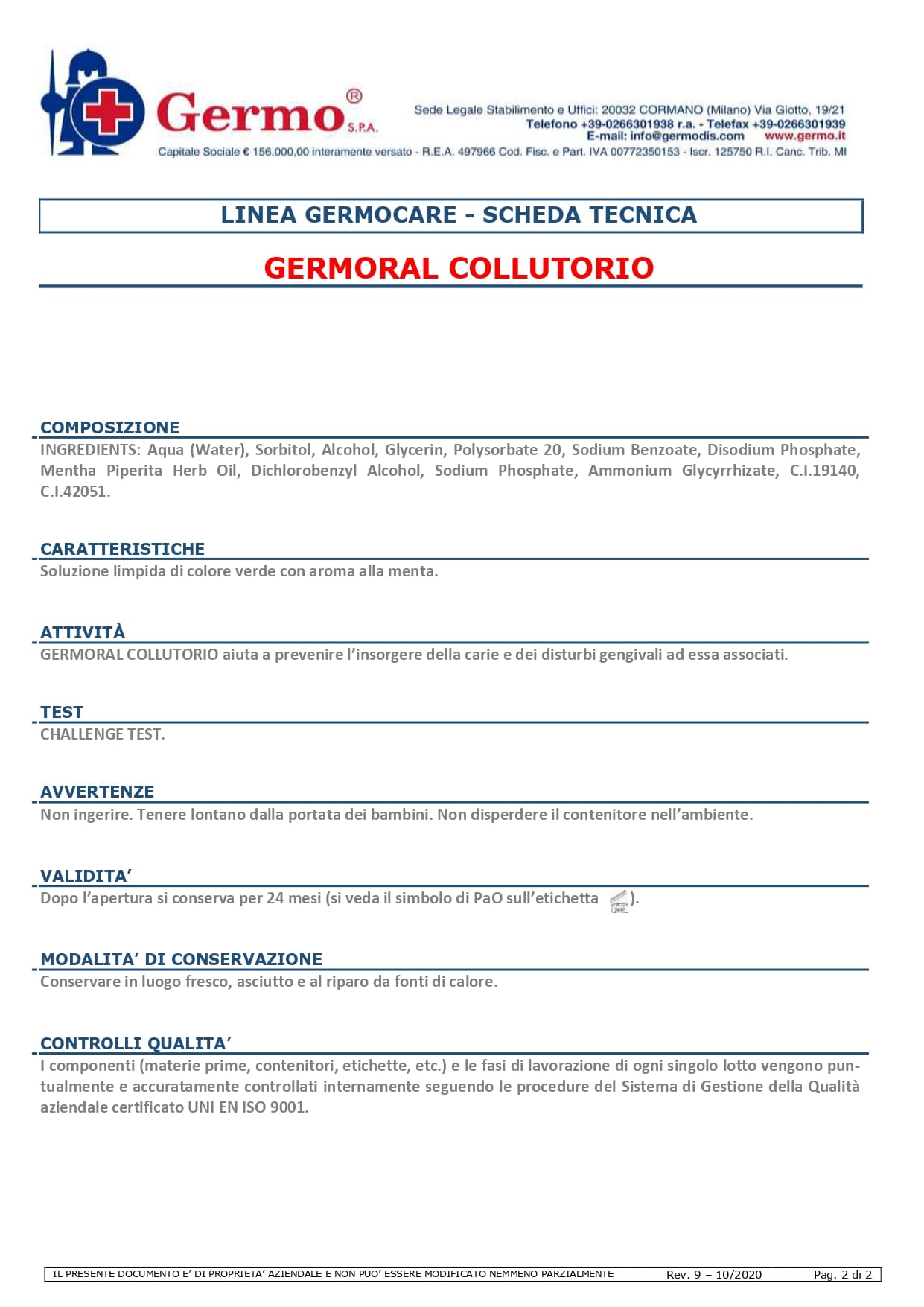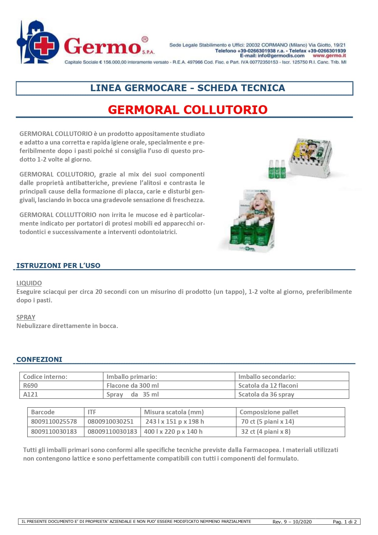 GERMORAL COLLUTORIO è un prodotto appositamente studiato e adatto a una corretta e rapida igiene orale, specialmente e preferibilmente dopo i pasti poiché si consiglia l’uso di questo prodotto 1 2 volte al giorno.